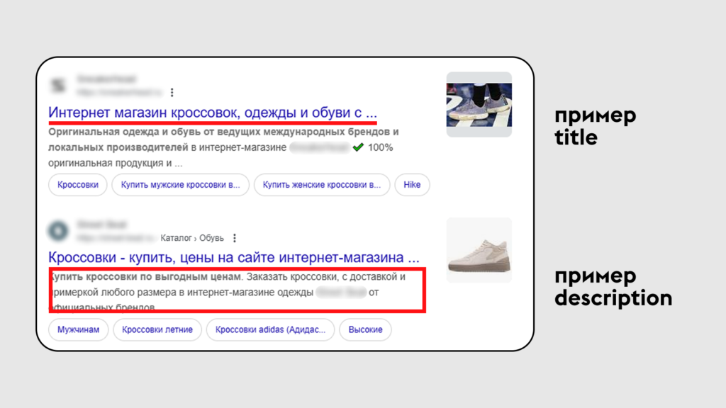 - Title — это 50—60 символов, которые должны содержать ключевые слова и нести смысл. Если у вас интернет-магазин кроссовок, не пишите «Главная» или «Обувь». Лучше: «Кроссовки Nike и Adidas — скидки до 50% | SneakersStore».